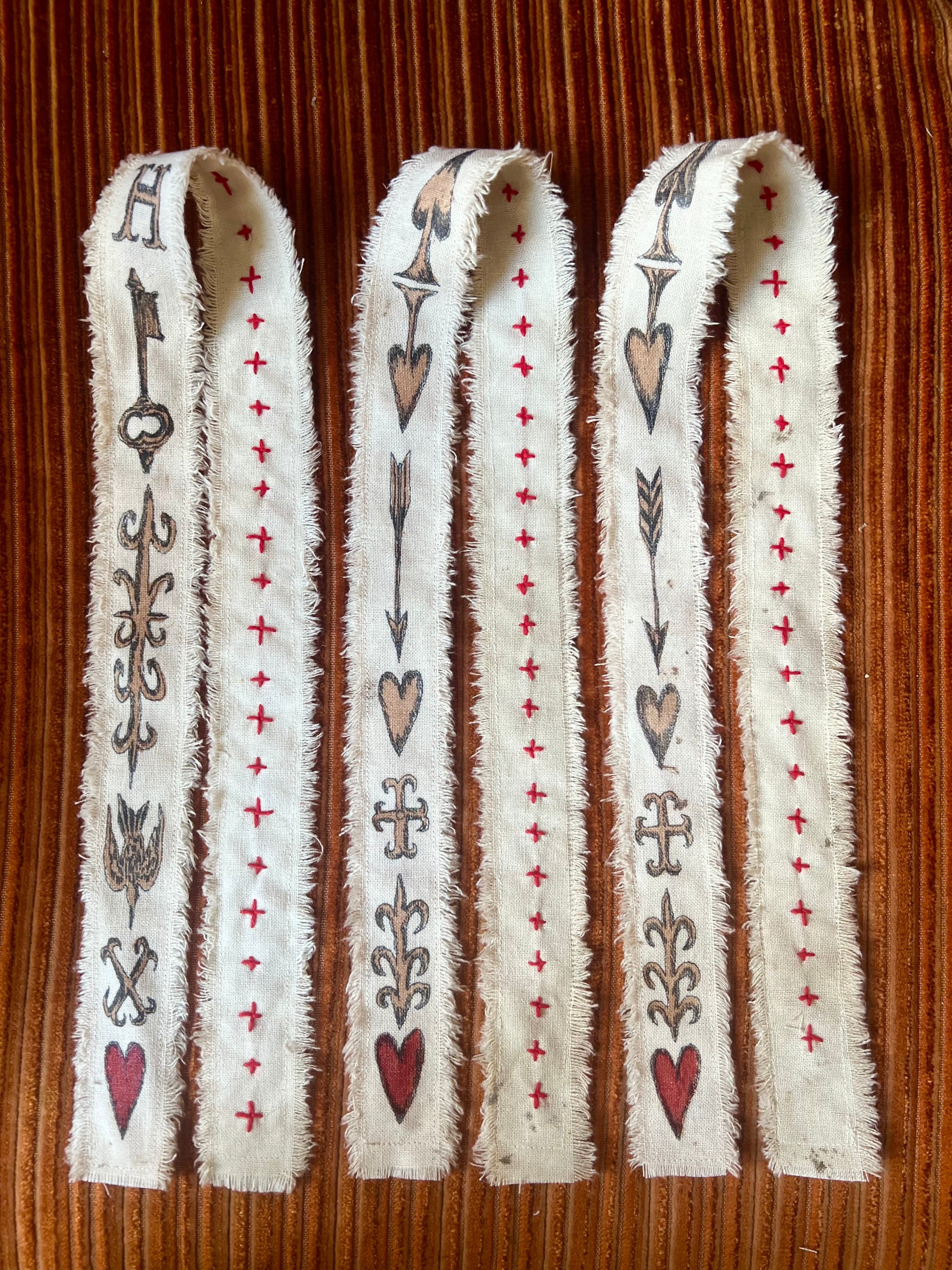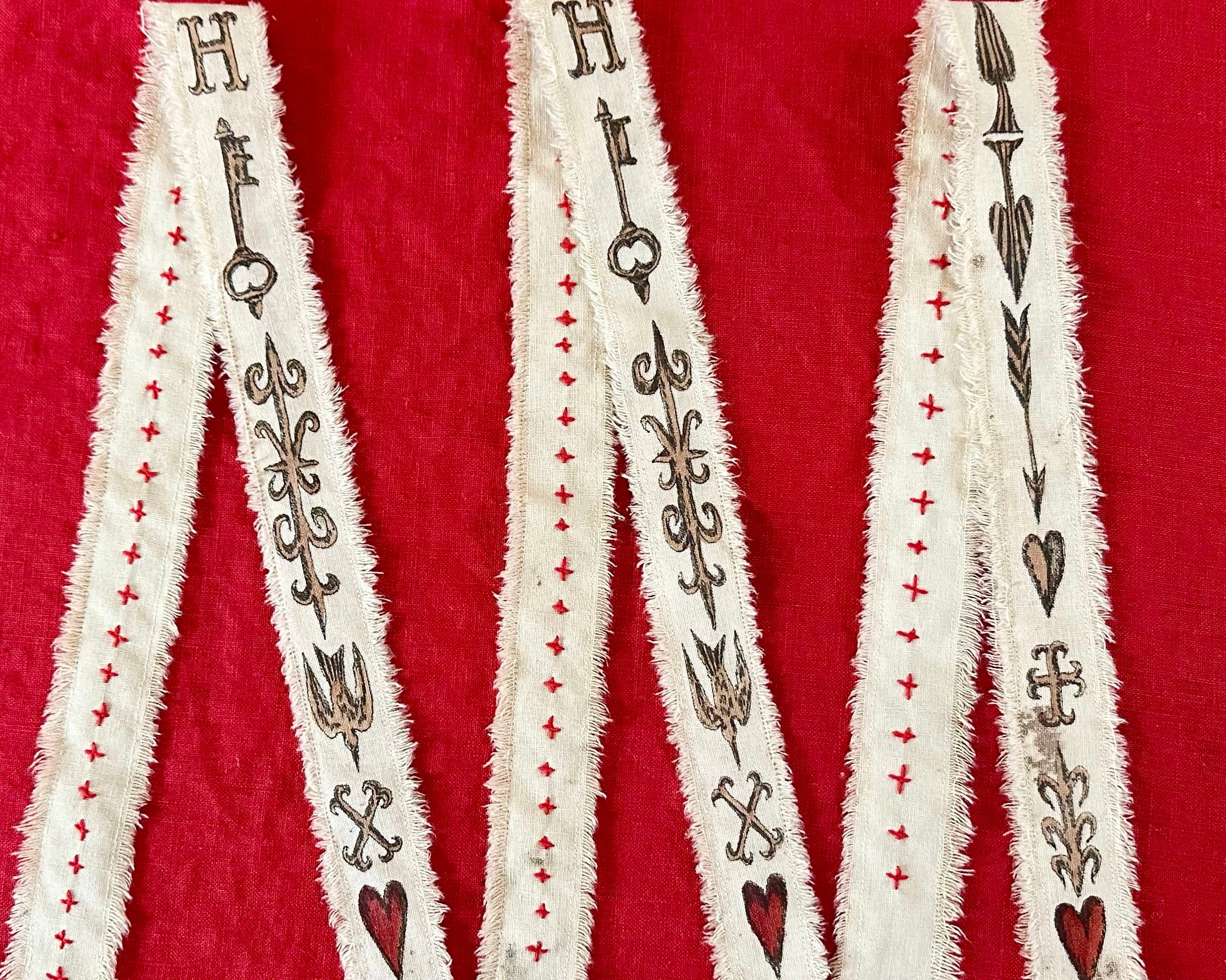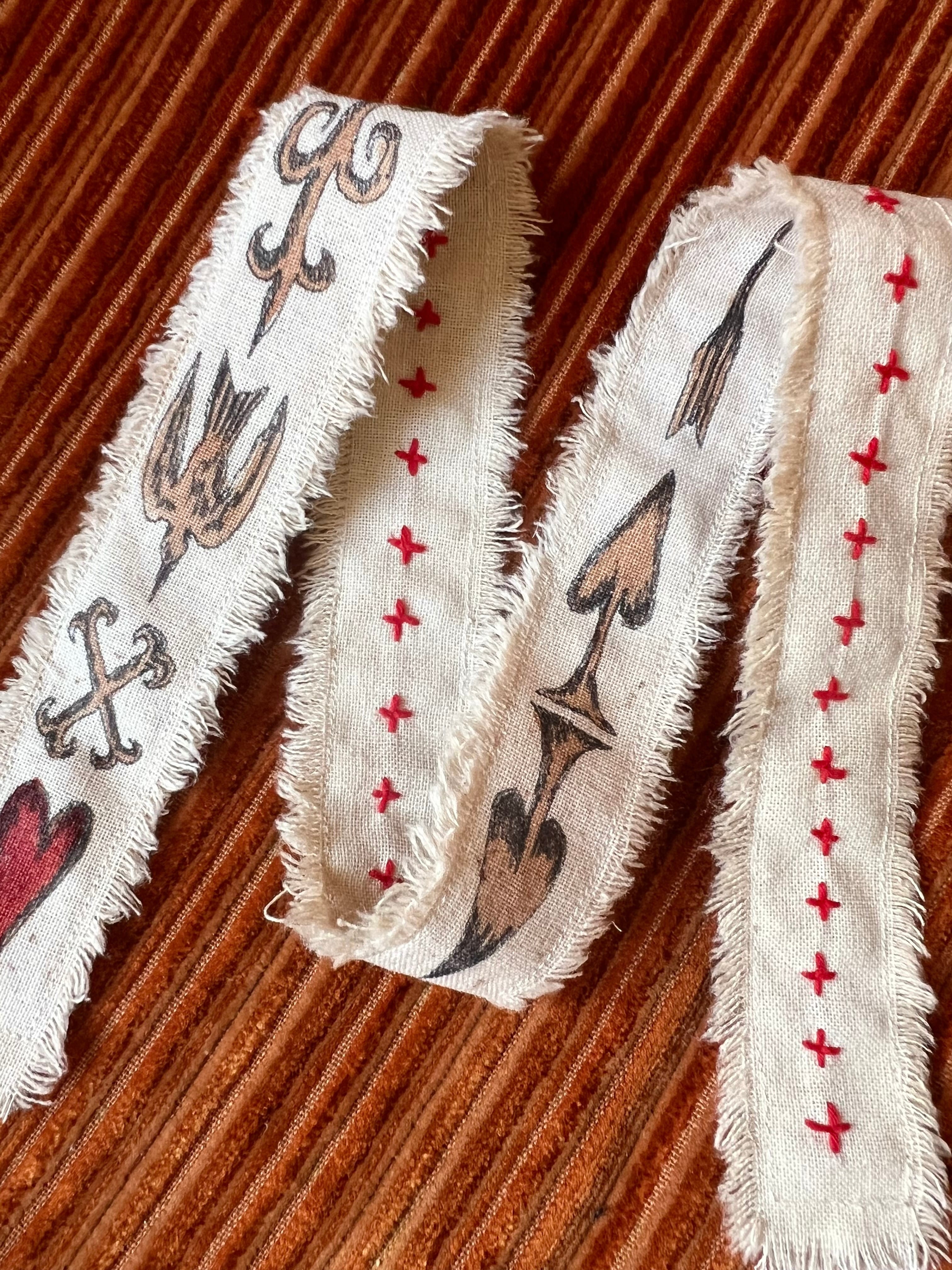ヴィンテージ加工を施した麻のリボンに、表面は鍵やハート、植物のような記号的なドローイングを、裏面には小さな十字の手刺繍を施しました。