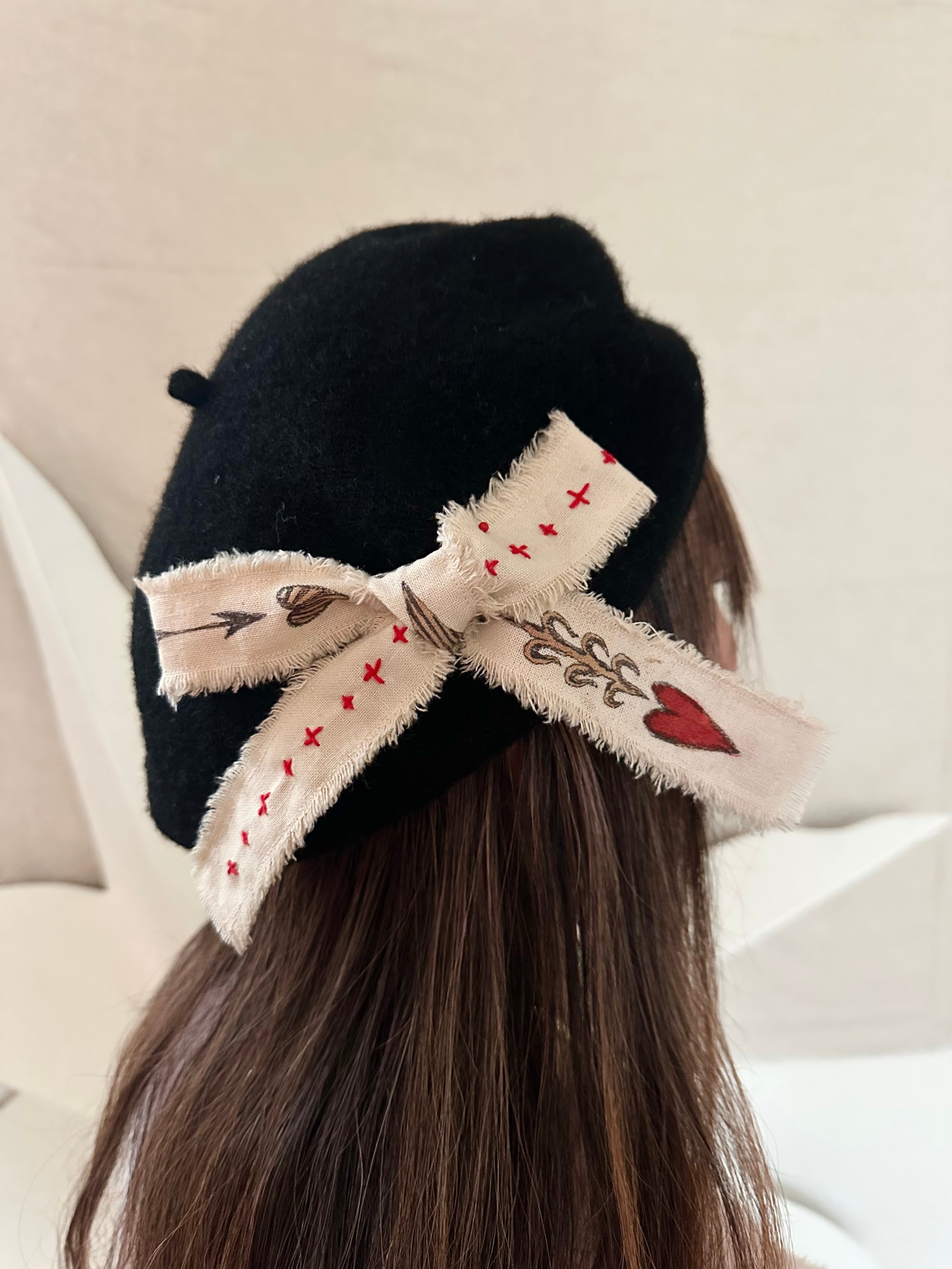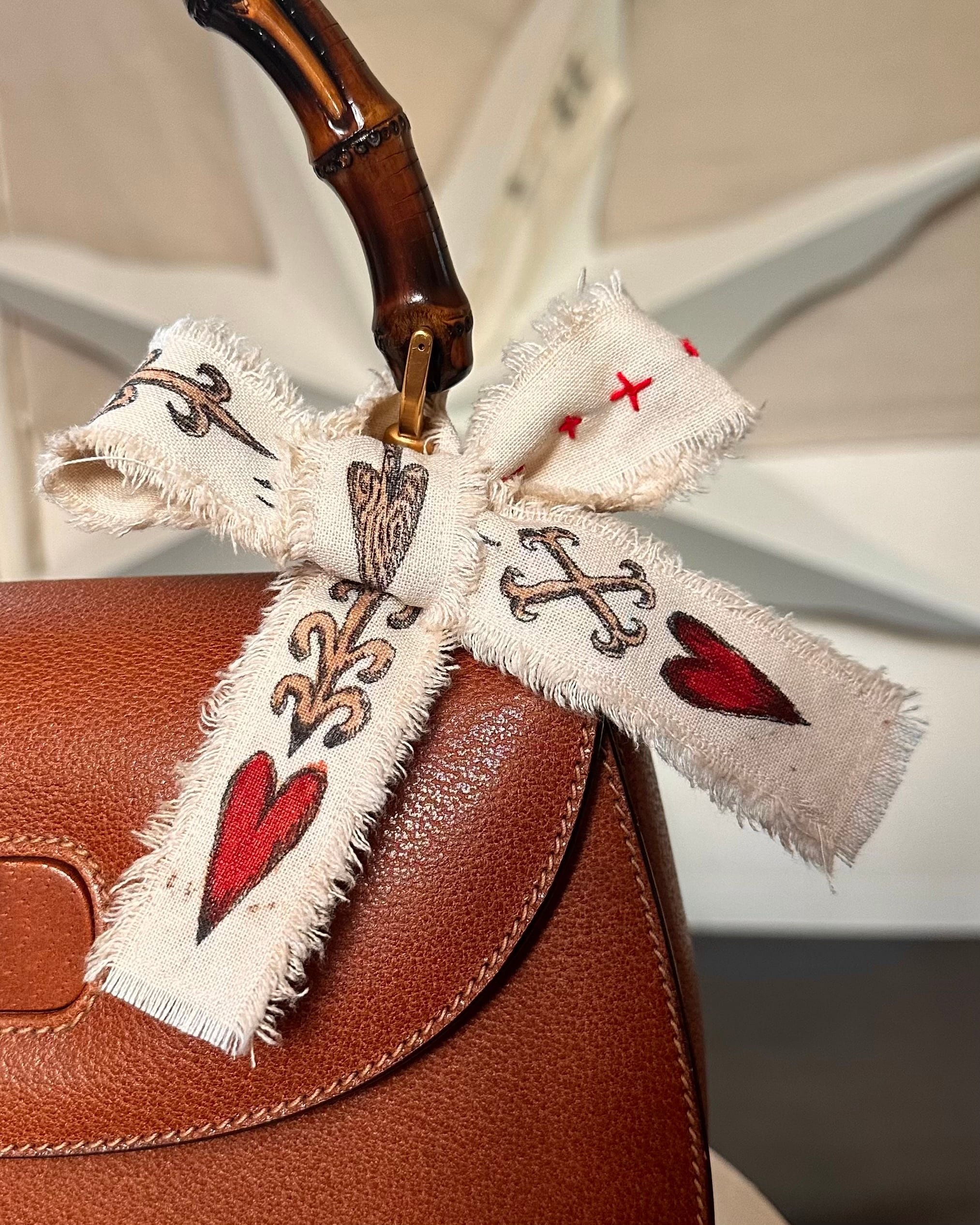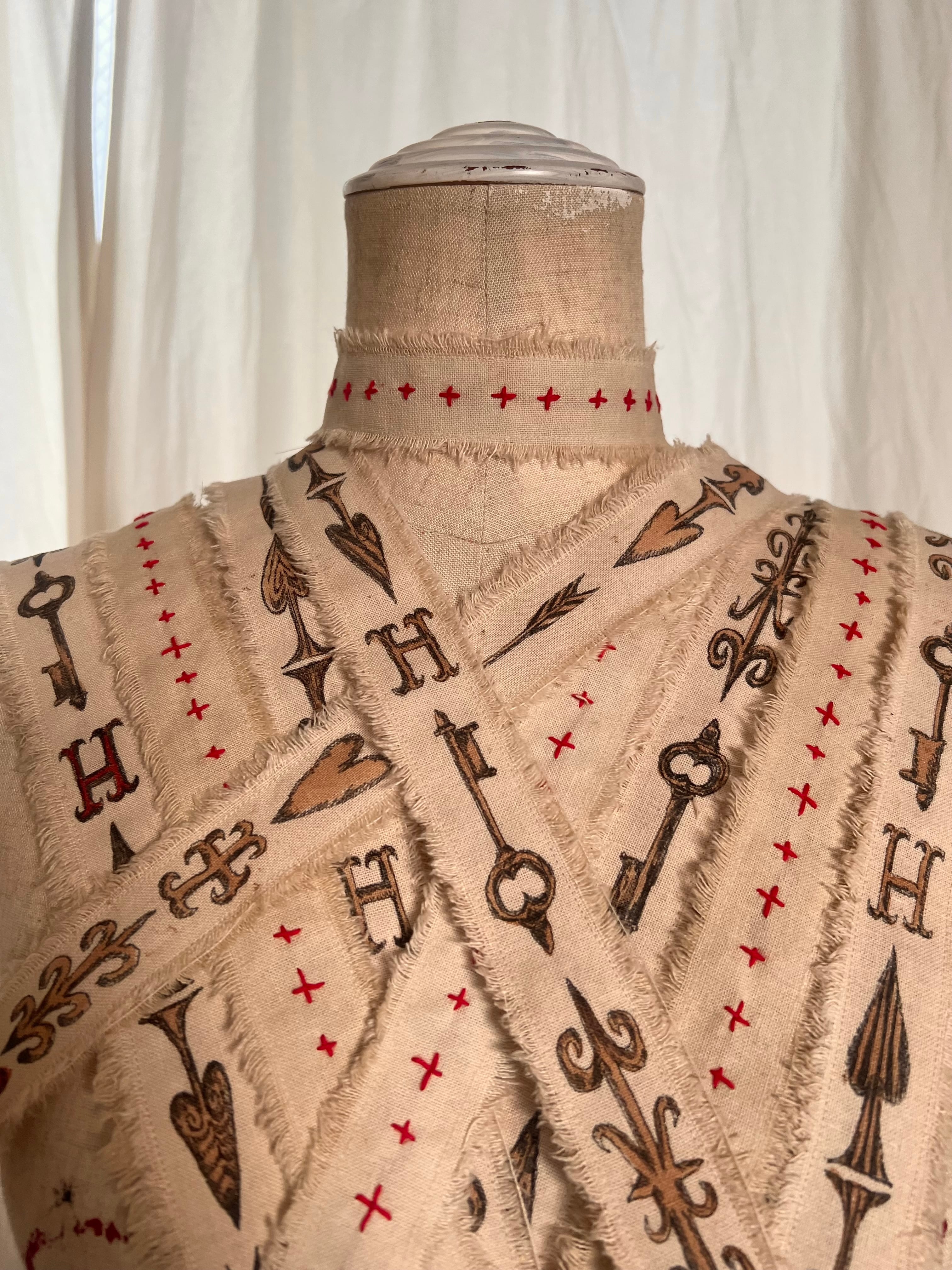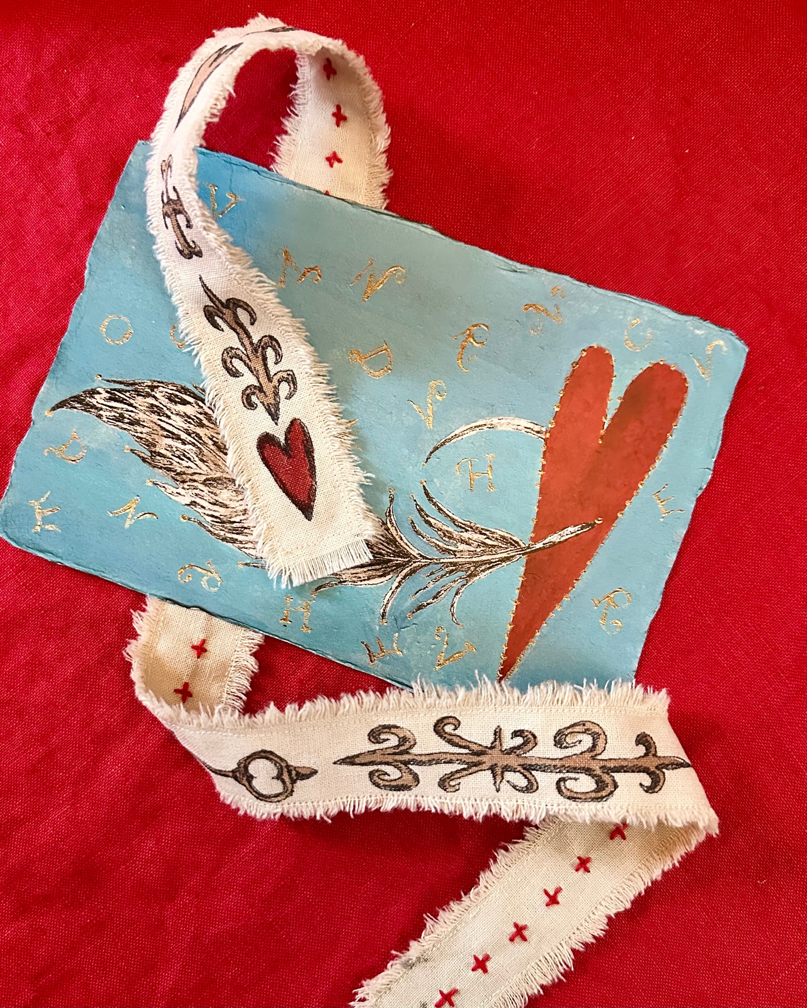 ヴィンテージ加工を施した麻のリボンに、表面は鍵やハート、植物のような記号的なドローイングを、裏面には小さな十字の手刺繍を施しました。