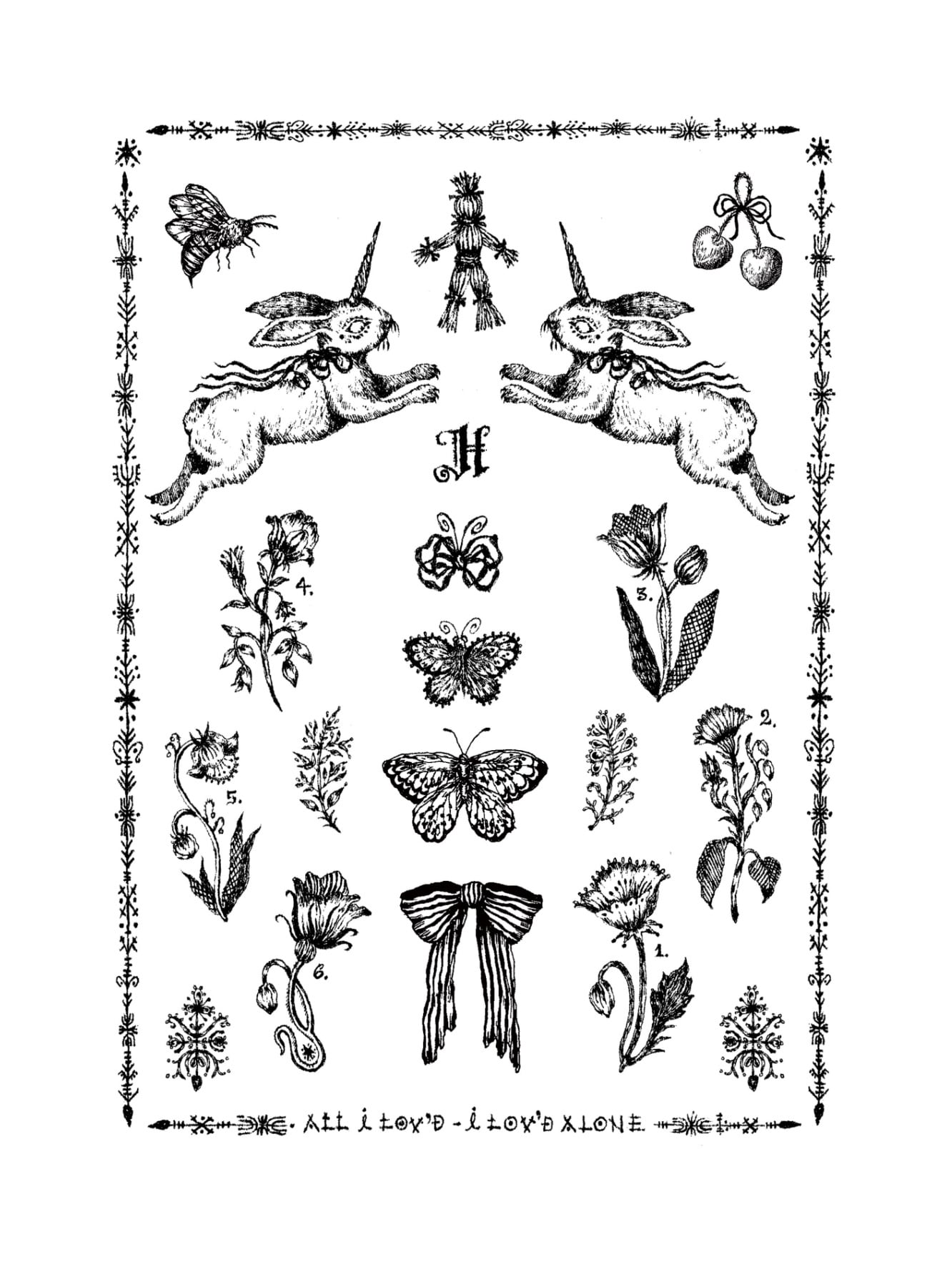 空を飛ぶ双角の兎、浮遊する蝶、祈りの藁人形、秘めた草花。わたしたちのSecret Garden(秘密の花園)にきらめくシンボルたちを描きました。しるしを結うという小さな儀式。